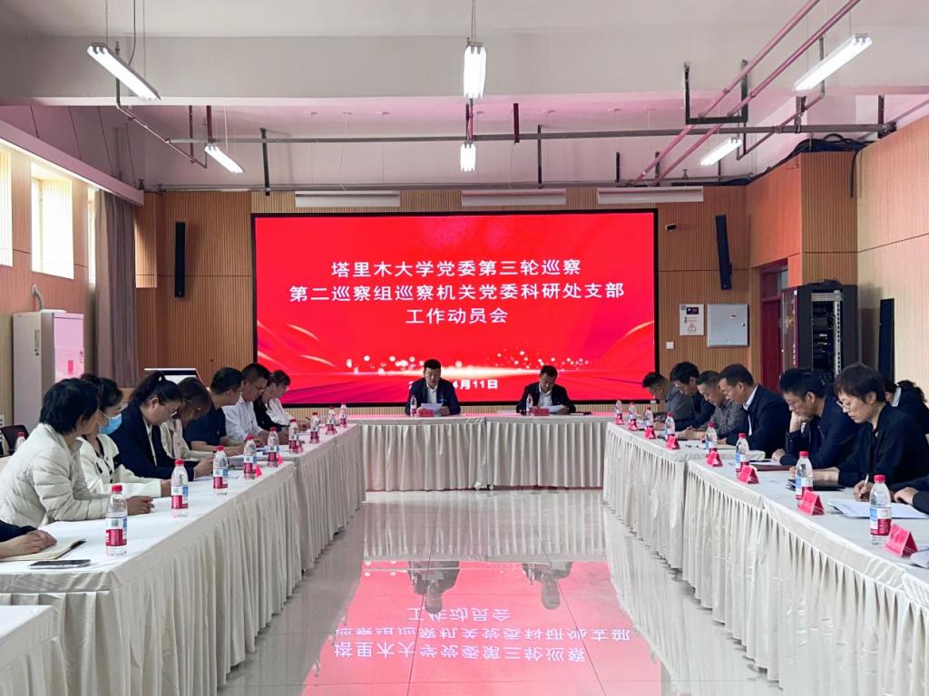 4月11日,三届塔里木大学党委第三轮巡察第二巡察组进驻机关党委科研处党支部动员会在南疆技术转移中心219会议室召开。第二巡察组组长朱夺宝作动员讲话并提出工作要求,机关党委科研处党支部书记、科研处(科技成果示范推广处)处长倪善强主持会议并作表态发言。